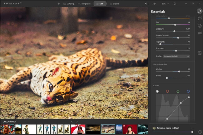 Luminar AI nos presenta una nueva interfaz de usuario, más limpia, más moderna. Está dividida en cuatro secciones principales: ‘Catálogo’, ‘Templates’, ‘Editar’ y ‘Exportar’. Esto genera un flujo más rápido y ordenado que la versión anterior de Luminar.