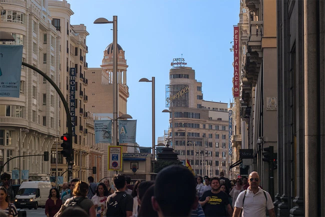En este caso vamos a trabajar con una fotografía de uno de mis alumnos. Estáis viendo la Gran Vía de Madrid por la tarde. El problema es que, en una situación de tanto contraste, el cielo ha quedado blanquecino, sin fuerza alguna. Él quiere verlo azul, así que no queda más remedio que buscar una solución.