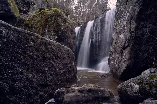 Quiero más luz en la caída, las piedras más oscuras y bajar la luminosidad del cielo. Y sobre todo y ante todo, corregir la verticalidad del agua. Un fallo por no colocar correctamente el trípode con un 14 mm.